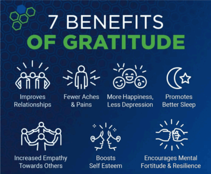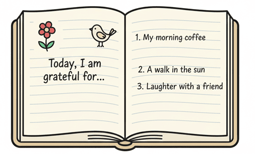 (B) Gratitude Journaling - Studies show that taking a few minutes each day to write down what we are grateful for has powerful effects on our health, both mentally (lower stress levels, less anxiety and depression, higher happiness scores) and physically (better sleep, lower blood pressure, fewer illnesses).